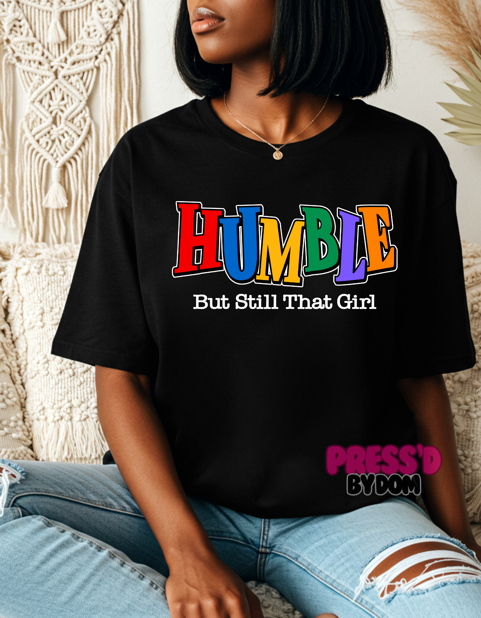 Stay grounded but never forget who you are. The “HUMBLE, But Still That Girl” tee from Press’d by Dom is your bold reminder that confidence and humility can coexist. Featuring a vibrant, multicolored “HUMBLE” graphic with a crisp white statement below, this shirt is a whole mood. Perfect for the girls who don’t brag but could if they wanted to.
